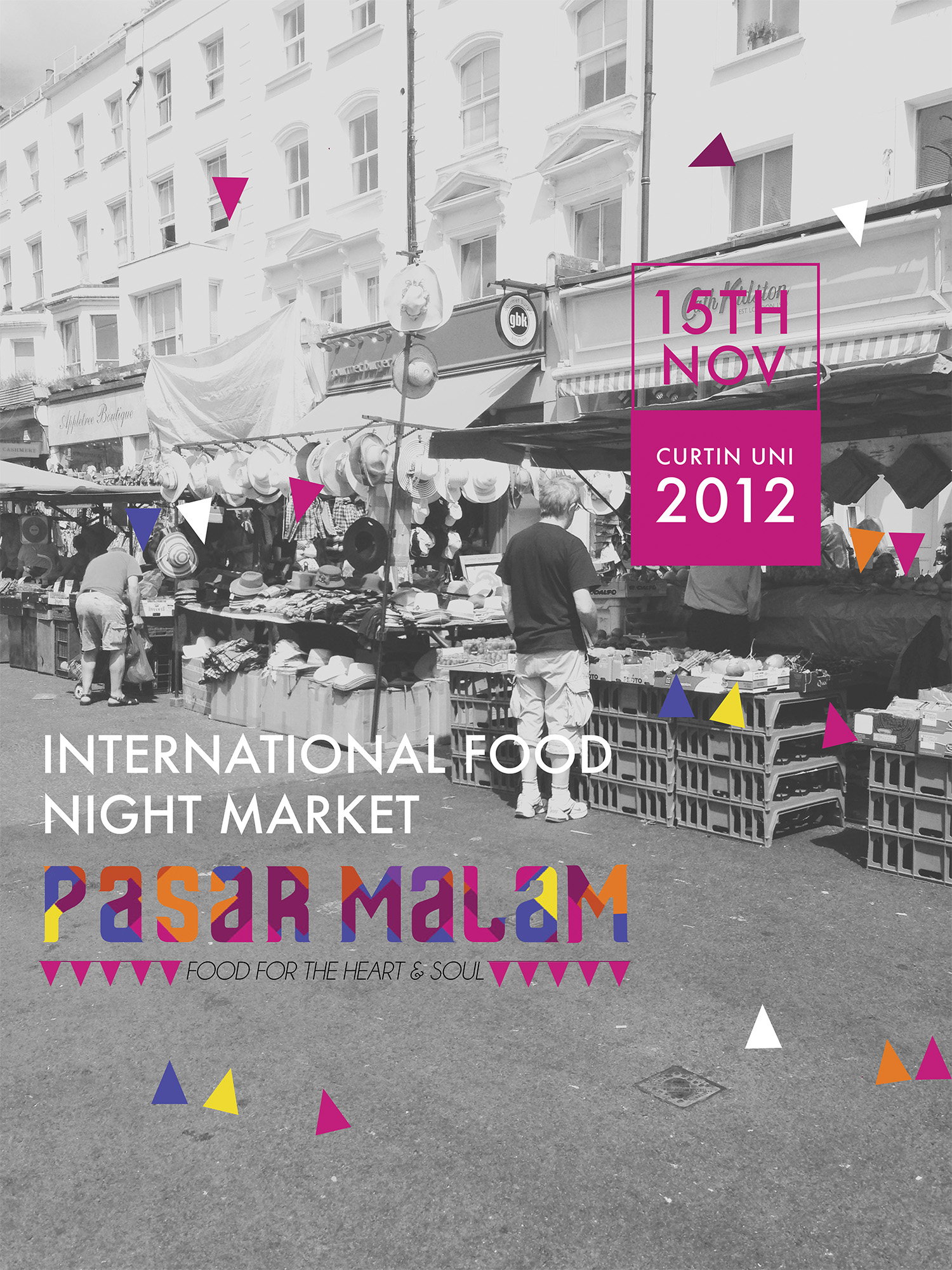 Pasar Malam is an annual international food market at Curtin Univeristy. It was a compeition where we were to design the logo, branding and t-shirts for the event.
